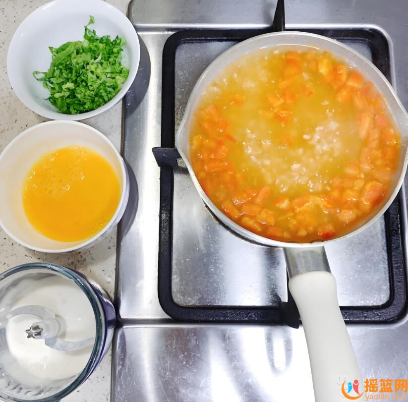 3.平底鍋熱油,放胡蘿卜翻炒1分鐘,加適量的水煮開